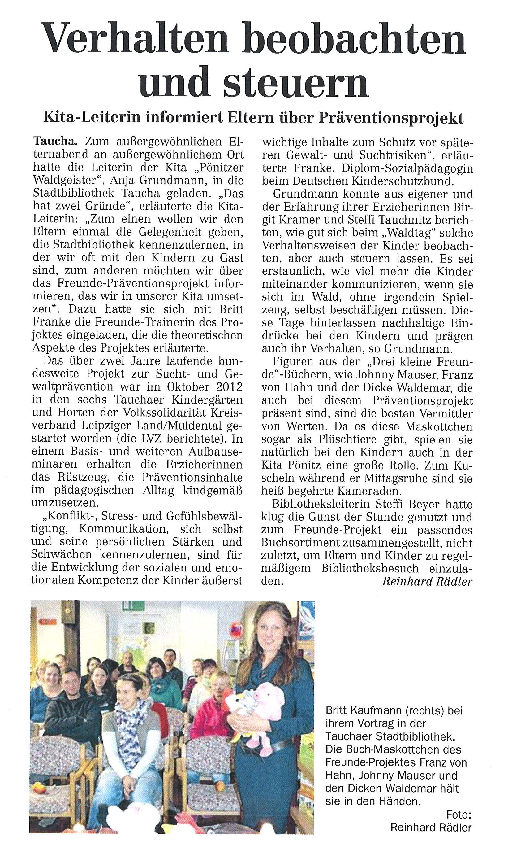Die Kita "Pönitzer Waldgeister" führte Ihren Elterninformationsabend zum Sucht-und Gewaltpräventionsprojekt "FREUNDE" in der Stadtbibliothek Taucha durch. Das über zwei Jahre laufende Projekt starte im Oktober 2012 in allen Tauchaer Kita´s und Horten unseres Volkssolidarität Kreisverbandes Leipziger Land/Muldental e.V.
