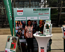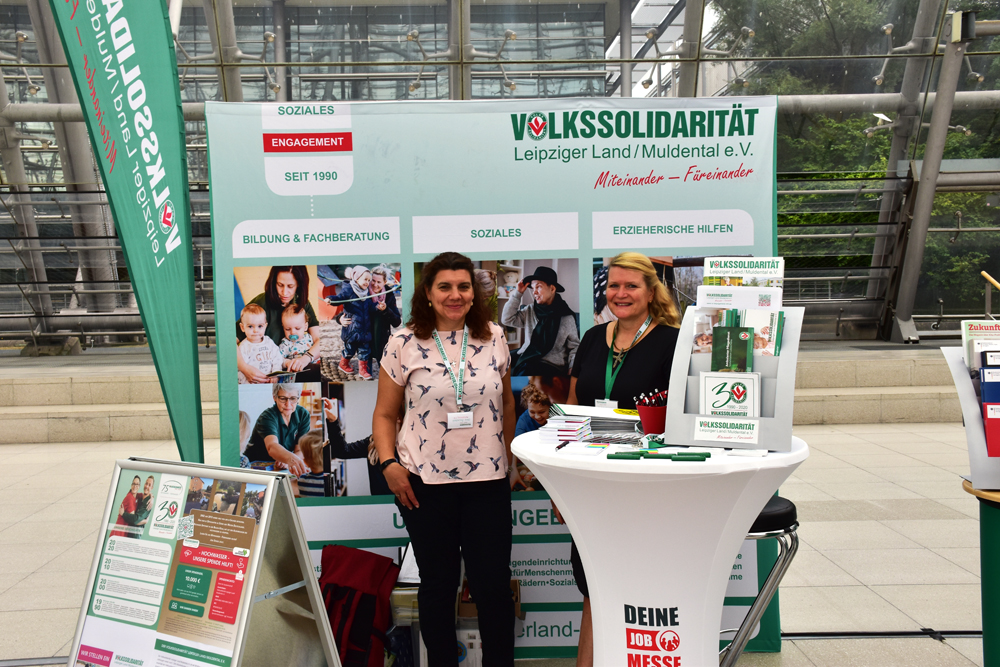An unserem Stand in der Glashalle der Leipziger Messe informierten unsere Fachberaterinnen aus dem Bereich Kita Sylvia Bernert und Jana Baumbach sowie Ina Beu (Bereich Öffentlichkeitsarbeit) über freie Stellen in unseren Einrichtungen in den Landkreisen Leipzig und Nordsachsen sowie der Stadt Leipzig und gaben Antworten zu Ausbildungsmöglichkeiten, beruflichen Voraussetzungen und zur Volkssolidarität Leipziger Land/Muldental als Arbeitgeberin.