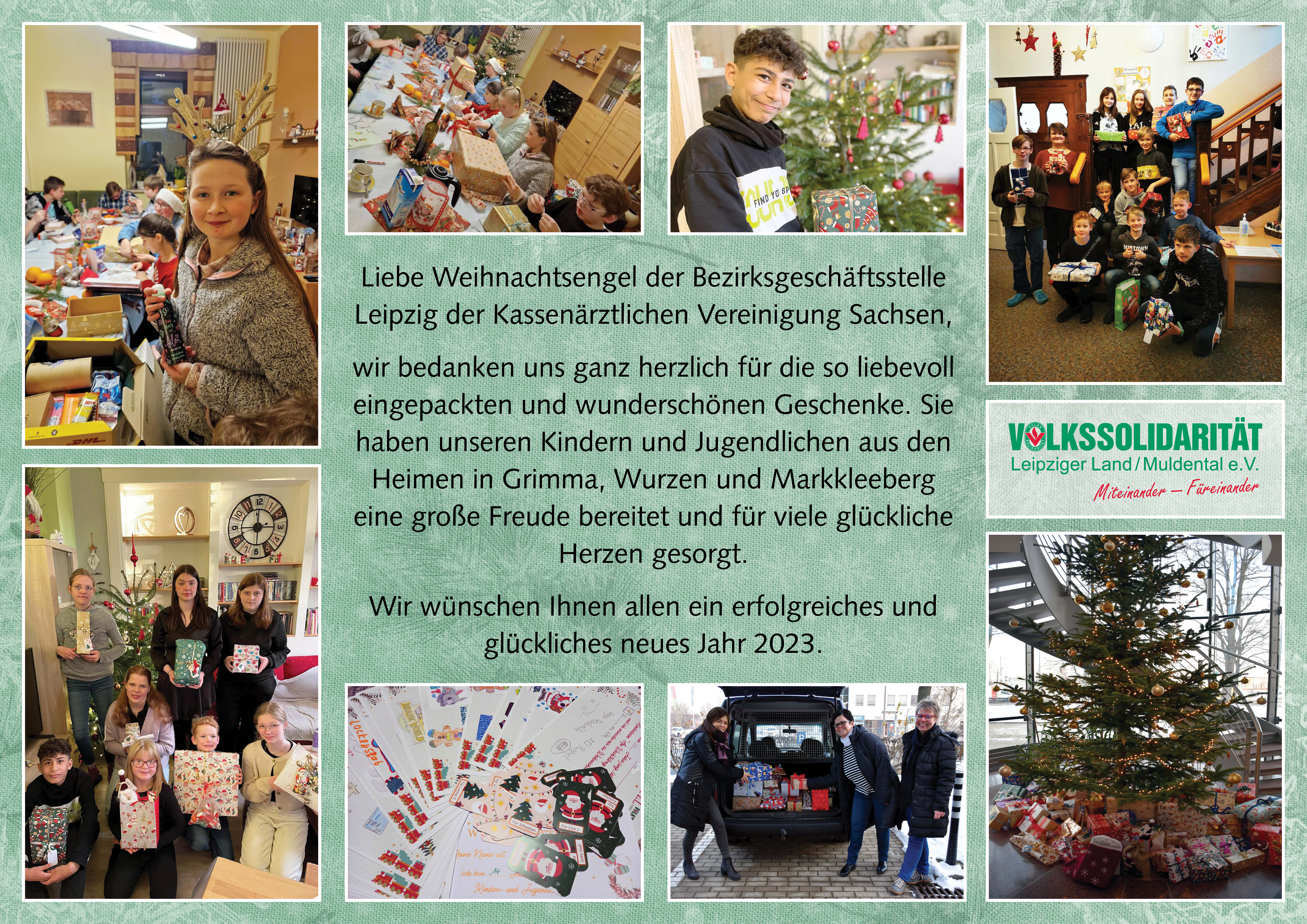 Wir bedanken uns ganz herzlich bei allen Mitarbeitenden der Bezirksgeschäftsstelle Leipzig der Kassenärztlichen Vereinigung Sachsen für die so liebevoll eingepackten und wunderschönen Geschenke. Sie haben unseren Kindern und Jugendlichen aus den Heimen in Grimma, Wurzen und Markkleeberg eine große Freude bereitet und für viele glückliche Herzen gesorgt.