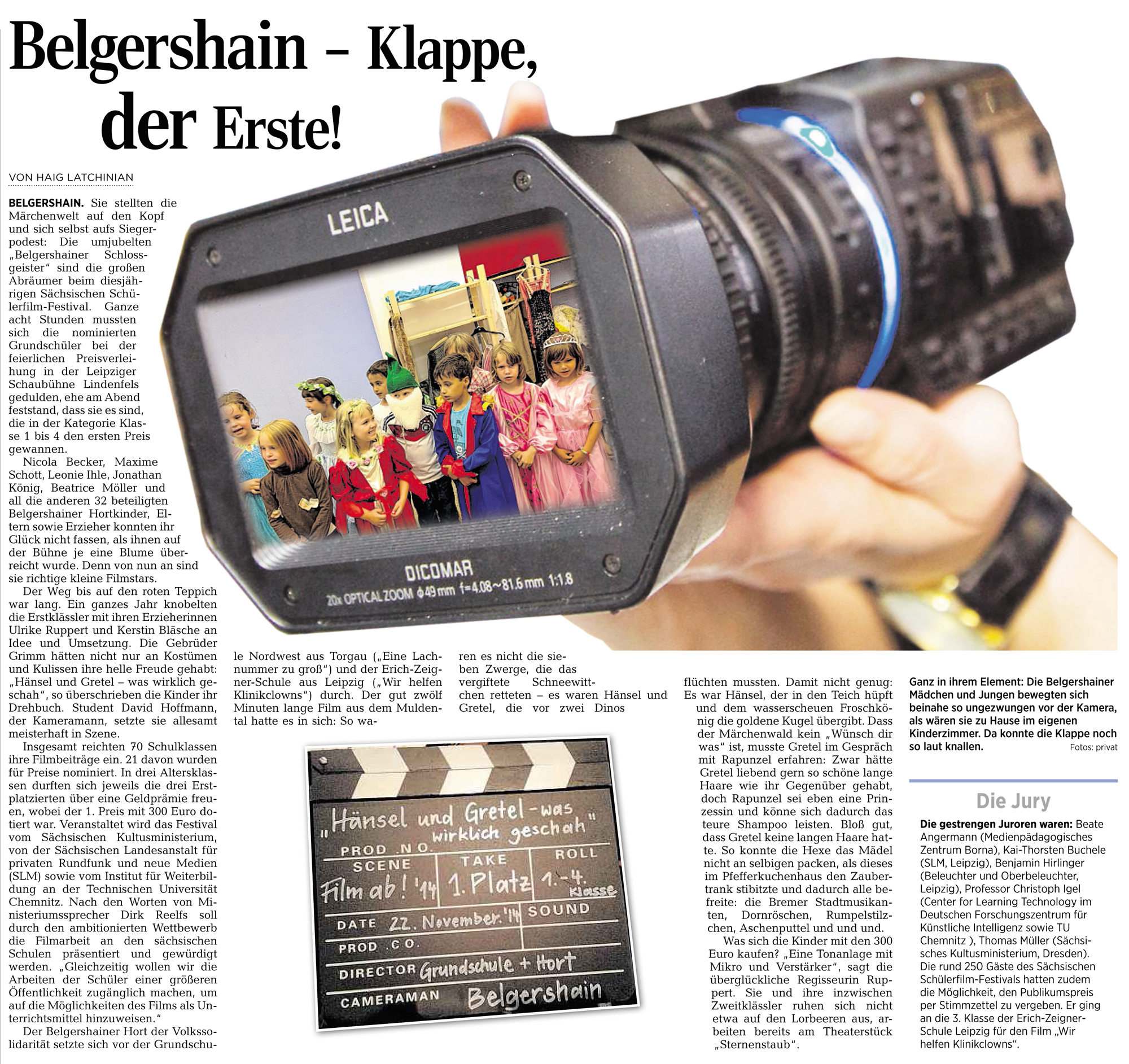 GLÜCKWUNSCH zum ersten Platz an die beteiligten 32 Hortkinder, Eltern sowie Erzieher unserer Horteinrichtung "Belgershainer Schlossgeister"! Mit dem 1. Platz von 70 teilnehmenden Schulkassen waren sie die großen Abräumer beim diesjährigen Sächsischen Schülerfim-Festival.