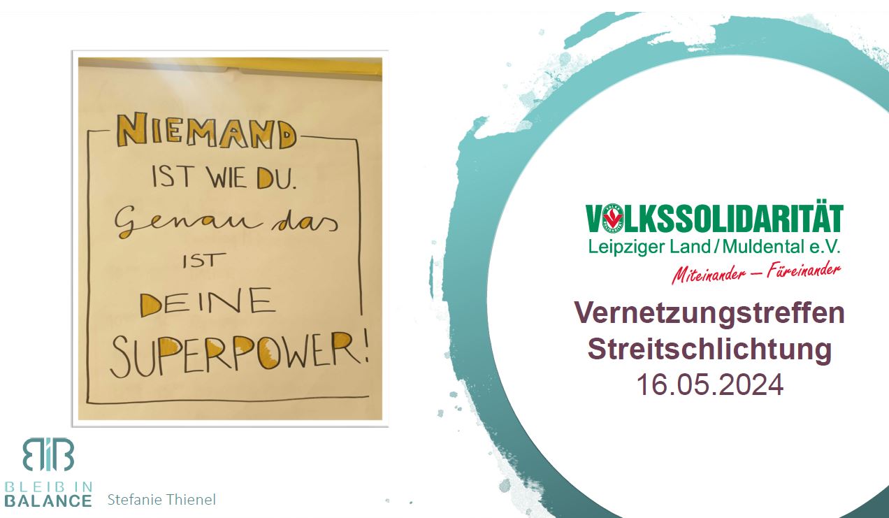 Am 16. Mai 2024 fand im Besprechungsraum unserer Kita „Gundorfer Sonnenkinder“ unser jährliches Vernetzungstreffen zur Streitschlichtung statt. Diese Veranstaltung wurde vom Fachbereich Bildung und Fachberatung des Volkssolidarität Leipziger Land/Muldental e.V. organisiert und von Stefanie Thienel (Bleib in Balance) moderiert.