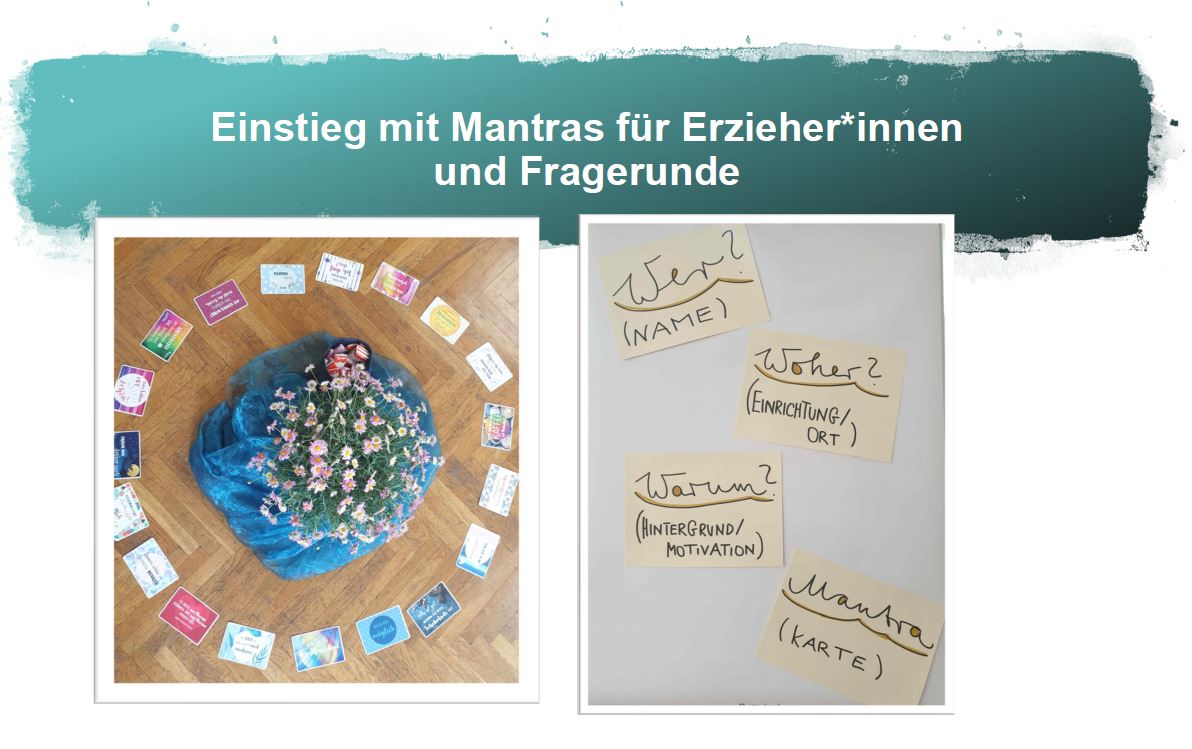 Der Tag begann mit einem Einstieg durch Mantras für Erzieher:innen und einer Fragerunde, um ein gegenseitiges Kennenlernen zu erleichtern. Fragen wie „Ich bin in Sachsen geboren“, „Ich mag das Meer lieber als die Berge“ und „Ich habe schon einmal die Ersthilfe im Streit angewendet“ halfen dabei, Gemeinsamkeiten und Unterschiede zu entdecken.