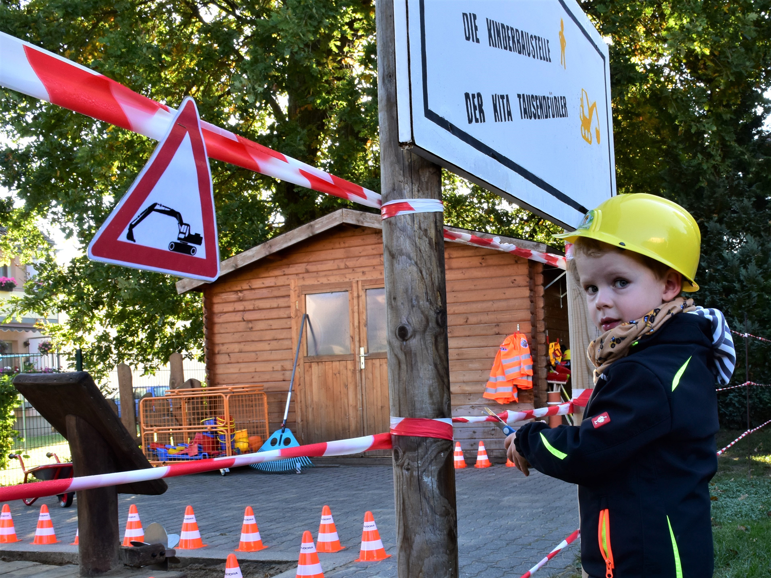 Der vierjährige Eric, der sich am Wochenende gerne mit seinem Papa große Baustellen anschaut und die beeindruckenden Maschinen bestaunt, schnitt als Bauleiter stolz das Absperrband durch und gab damit die liebevoll eingerichtete Baustelle für alle Kinder frei.