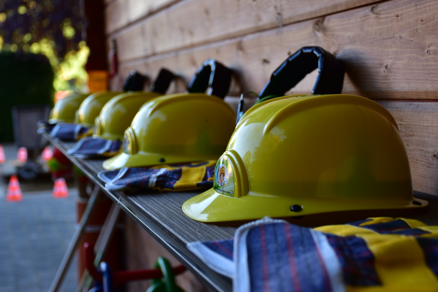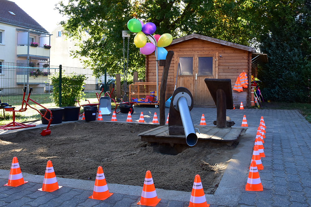 Seit Anfang Oktober 2021 lädt unsere Kinderbaustelle mit einem roten Bagger, verschiedenen Geräten und Werkzeugen sowie einer Plattform mit Schaufelrad zum Buddeln, Bauen, Planieren und Messen ein. Ausgerüstet mit Schutzhelmen, Warnwesten und Ohrschützern – selbstverständlich in passenden Kindergrößen – können sich unsere Kinder im Schatten der großen Eiche austoben.