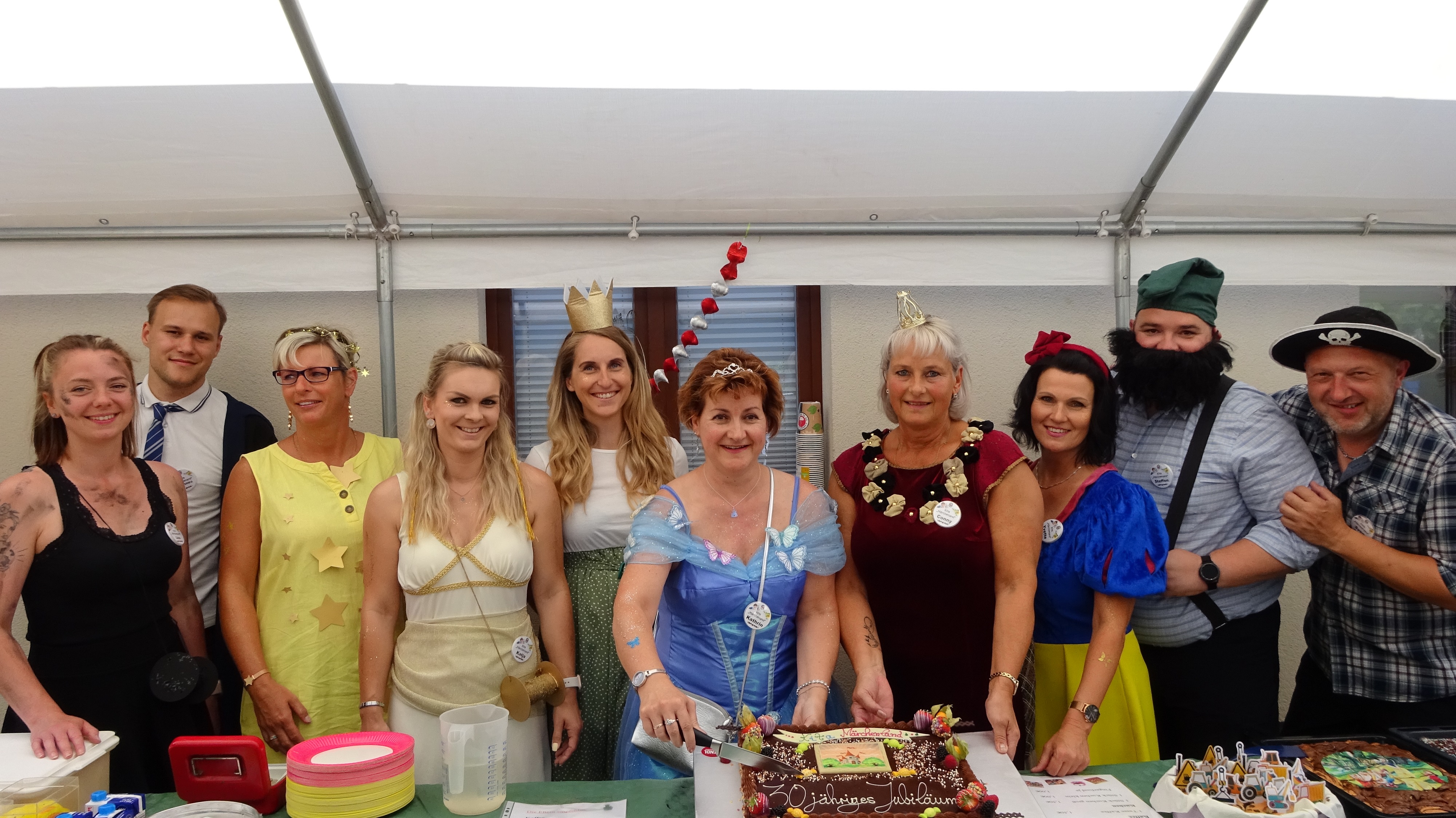 Der Geschäftsführer unseres Trägers, Herr Dr. Bandekow, bedankte sich dafür beim Team Märchenland sowie allen Ehemaligen, die dazu beitrugen. Natürlich funktioniert das nur in Kooperation mit den Eltern und anderen Weggefährten, so auch die Organisation der Festwoche und der Märchenparty. Wir arbeiteten schon im Vorfeld Hand in Hand mit den Eltern, den Gemeinden Belgershain und Pomßen sowie den Feuerwehren Belgershain und Threna. Ob es die Bierzeltgarnituren waren, amtliche Genehmigungen, der Zeltaufbau oder die Verpflegung. Alle halfen mit. Das zeigte uns, was wir gemeinsam alles schaffen können!