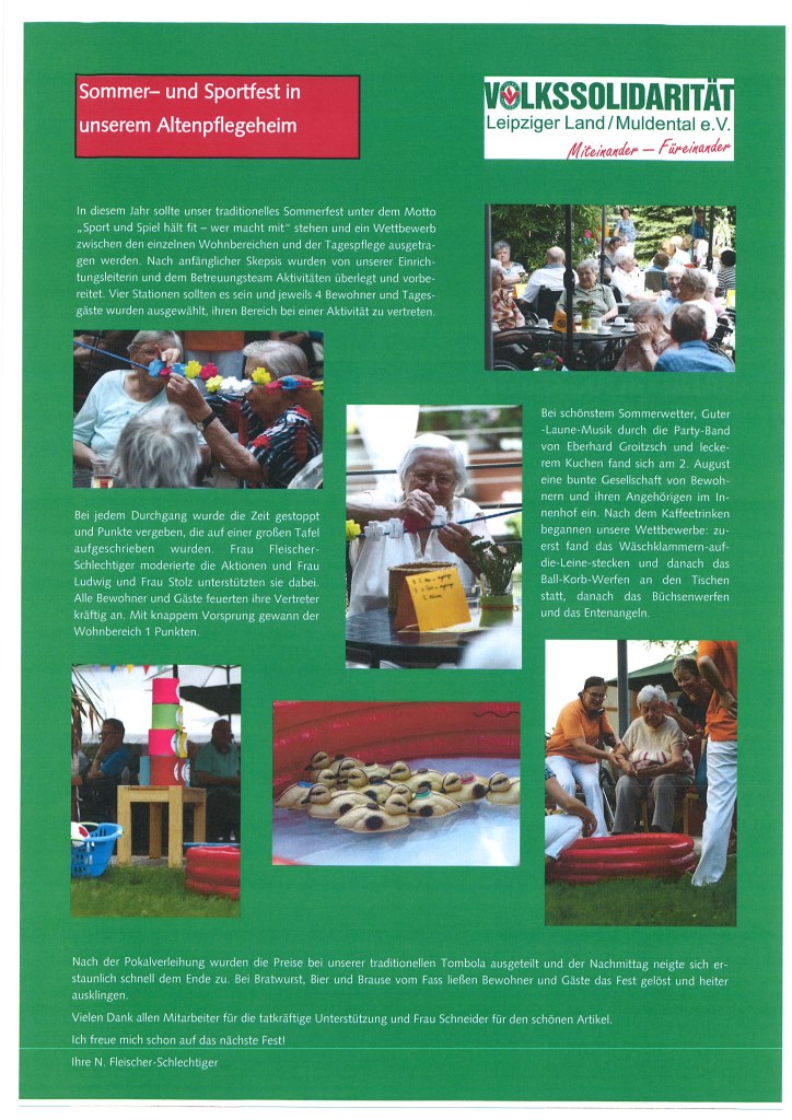 Nach dem Motto "Sport und Spiel hält fit - wer macht mit" fand in diesem Jahr das Sommerfest in unserem Altenpflegeheim Schkeuditz, Haus "An der Bergbreite" statt.