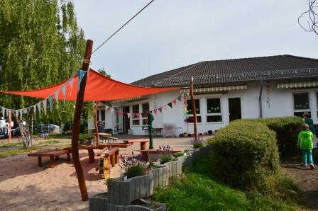 Unsere Einrichtung liegt in ländlicher Umgebung angrenzend an den Auenwald in ruhiger Lage. Bis zu 105 Krippen- und Kindergartenkinder fühlen sich in unserer noch recht neuen, sternförmigen Einrichtung sehr wohl. Ein 3.156 m² großer Garten bietet mit seiner großen Rasenfläche, einem Biotop, Rodelberg, Weidentipis und Hochbeet viel Platz zur individuellen Entfaltung der Kinder.