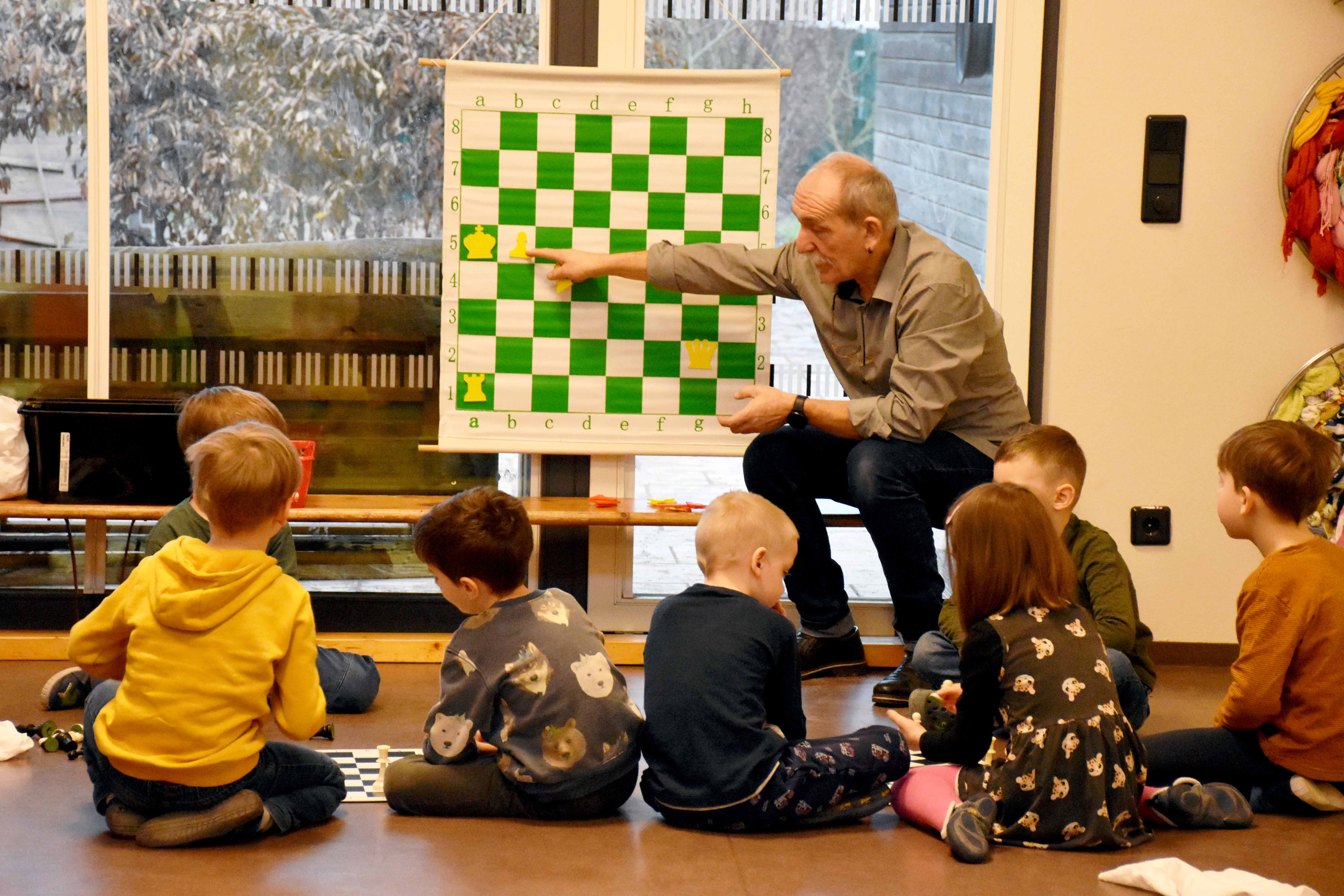 Ein- bis zweimal pro Woche treffen sich die Fünf- bis Sechsjährigen unserer Kita, um gemeinsam die Schachregeln zu lernen und Partien zu spielen. Der pensionierte, ehemalige Hortleiter der 60. Grundschule Harald Niesch engagiert sich 1x wöchentlich ehrenamtlich als Schachtrainer in der Kita. Alle Kinder im Vorschulalter lernen hier die Grundlagen.