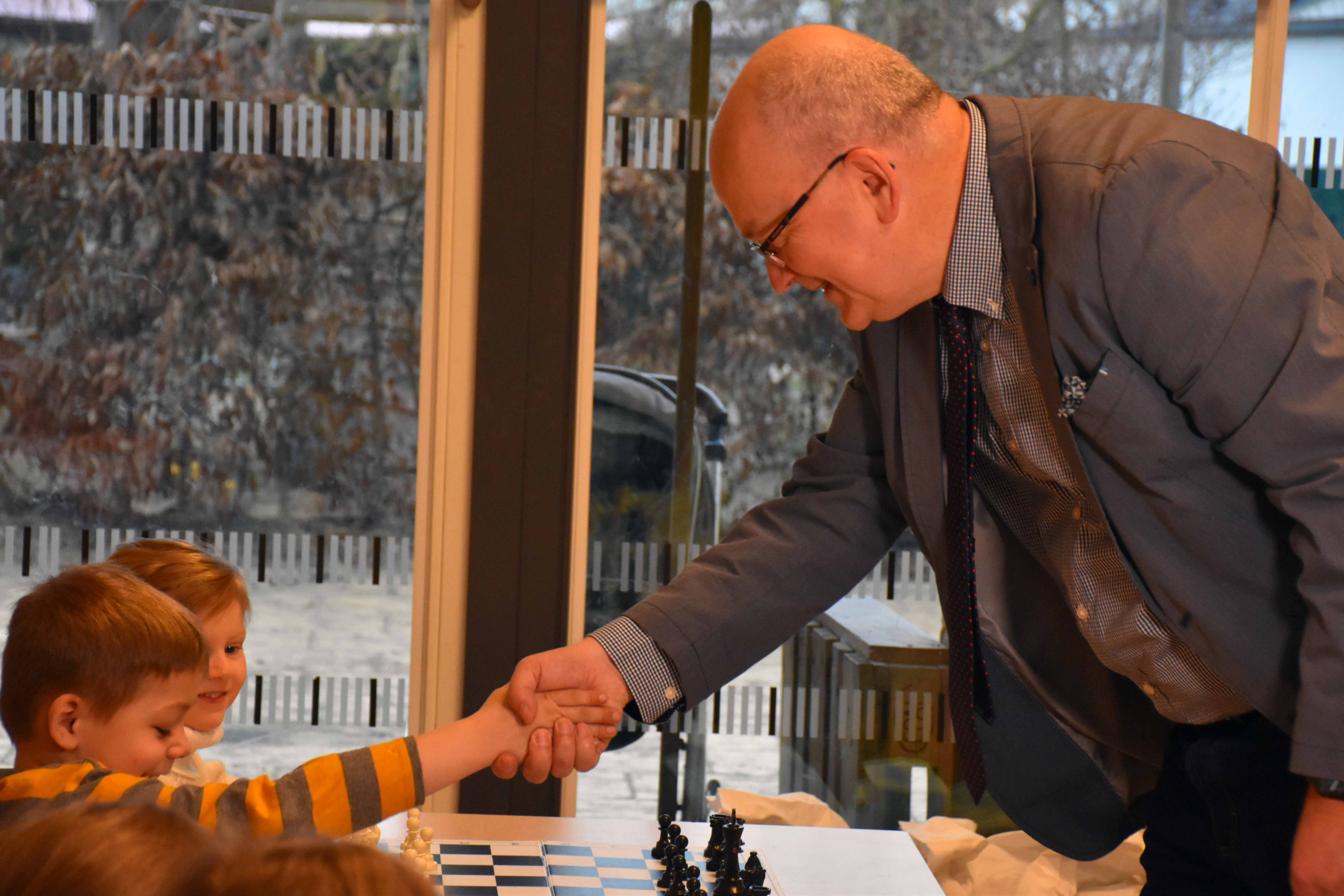Am 26. Juni 2018 hatten die fünf- und sechsjährigen Schachkinder unserer Kindertagesstätte „Holunderzwerge“ Haus 1 einen besonderen Besuch. Bundesminister a. D. Peer Steinbrück (in seiner Eigenschaft als Beiratsvorsitzender der Schachstiftung GK gGmbH) und der Präsident des Vereins „Kinderschach in Deutschland e. V.“ Dr. Gerhard Köhler (Hauptgesellschafter des Fotodienstleisters ORWO Net und Amateurweltmeister im Schach 2016) überzeugten sich vor Ort, wie ihr gemeinsames Projekt, das Schachspielen in den deutschen Vorschuleinrichtungen einzuführen, bei den „Holunderzwergen“ ankommt.
