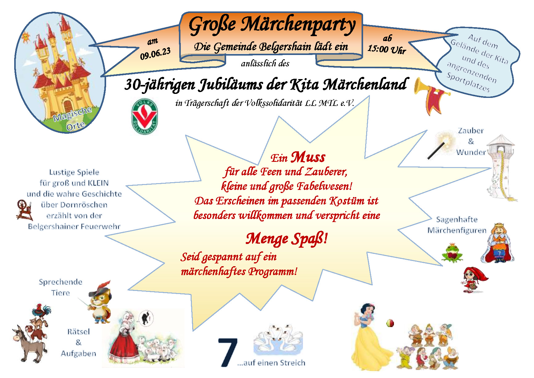 Unsere Kita "Märchenland" in Belgershain/Köhra feiert dieses Jahr ihr 30-jähriges Jubiläum in Trägerschaft der Volkssolidarität Leipziger Land/Muldental e.V. und veranstaltet am Freitag, den 9. Juni 2023 ab 15 Uhr eine "große Märchenparty". Eingeladen sind Ehrengäste und alle, die mitfeiern möchten.