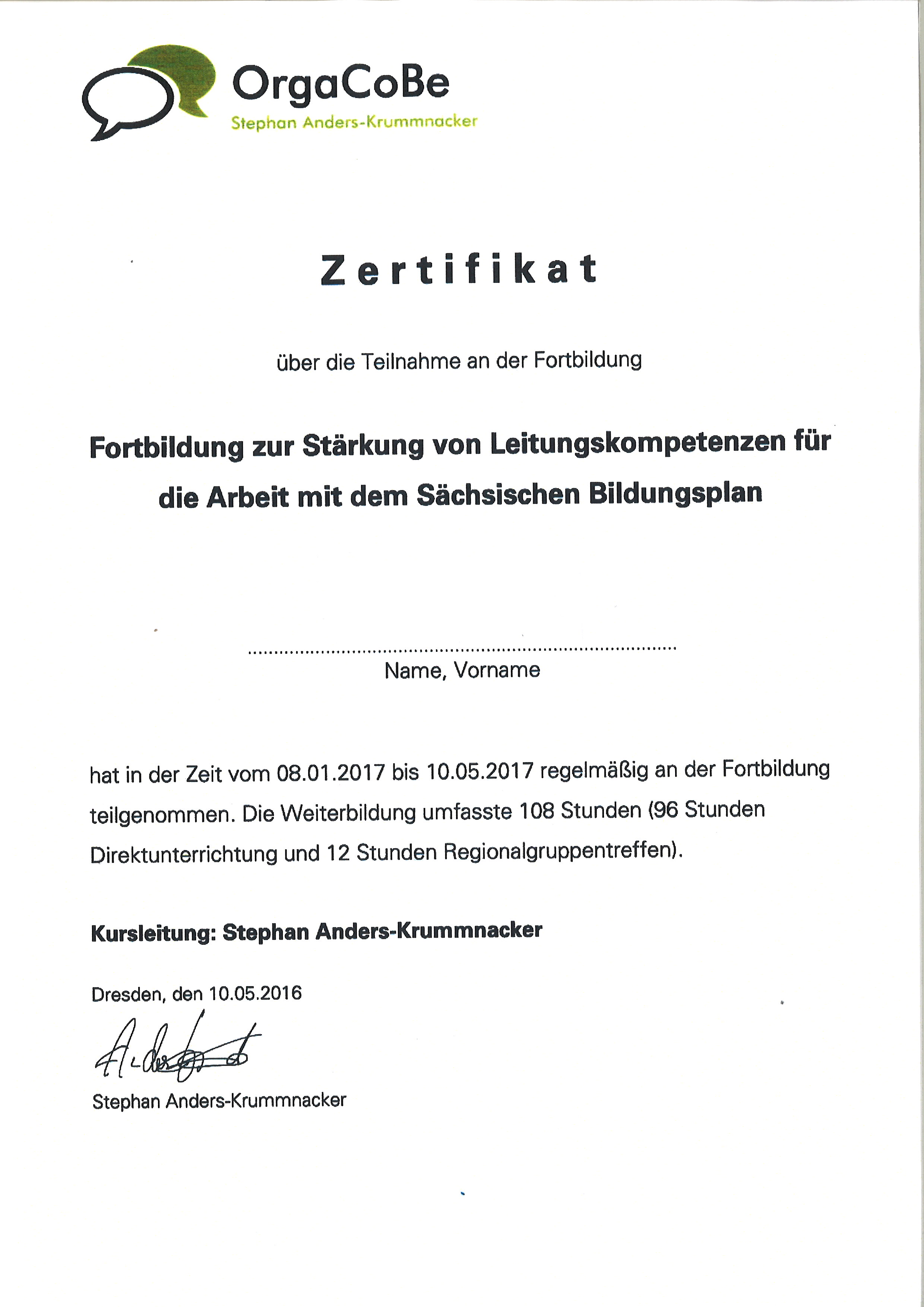 Erfolgreicher Abschluss der Kita-Leiter-Qualifikation zur Stärkung von Leitungskompetenzen für die Arbeit mit dem Sächsischen Bildungsplan