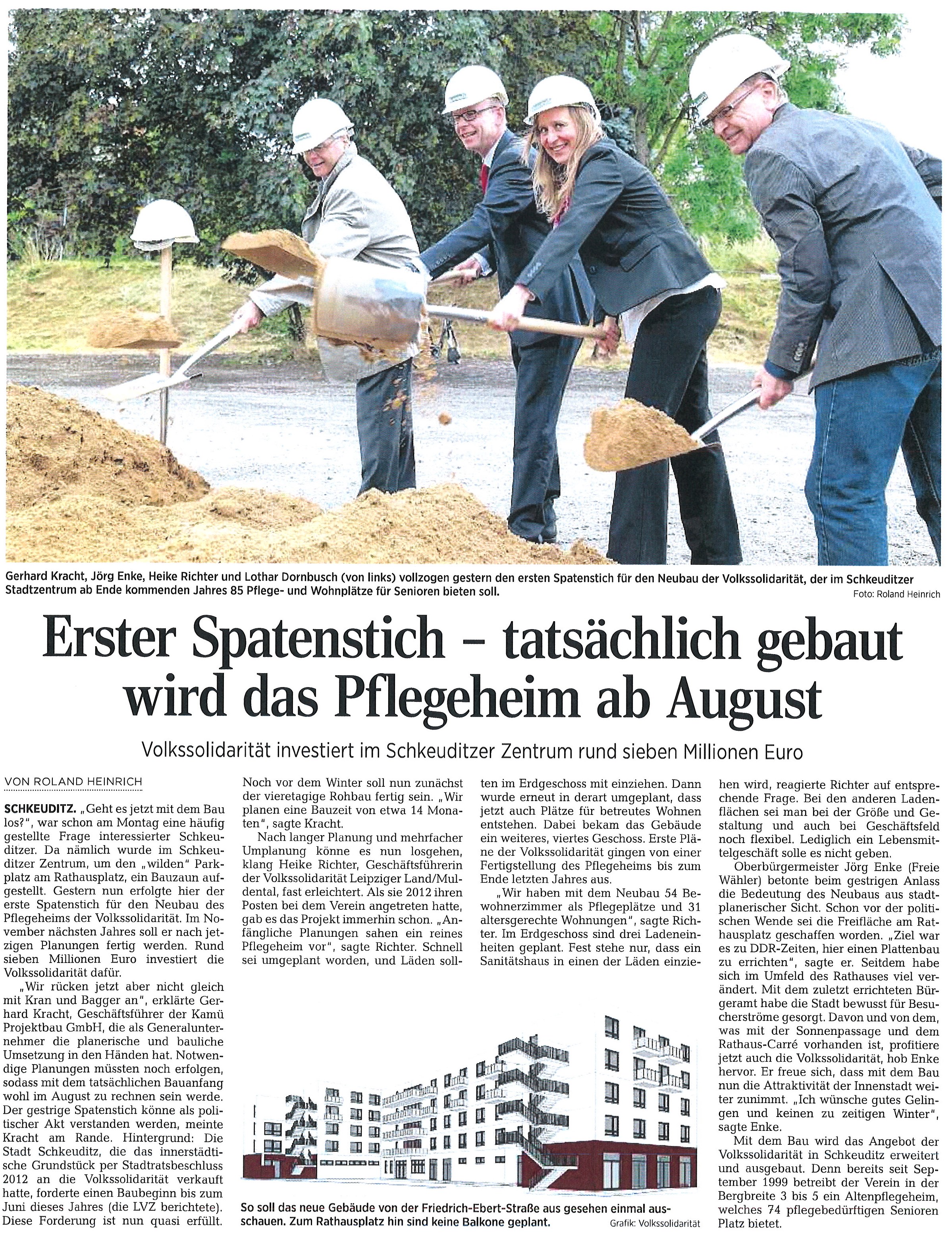 LVZ-Artikel "Erster Spatenstich" - tatsächlich gebaut wird das Pflegeheim ab August