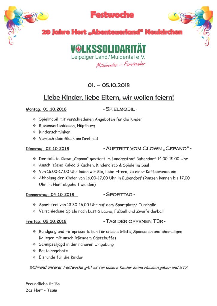 Anlässlich des 20-jährigen Hort-Jubiläums richtet unsere Einrichtung vom 1.-5. Oktober 2018 eine Festwoche mit verschiedenen Höhepunkten aus. Zum Abschluss der Festwoche am Freitag, den 5. Oktober öffnet unser Hort seine Türen für zahlreiche Gäste, Sponsoren und ehemalige Kollegen und lässt die Jubiläumswoche feierlich ausklingen - Interessierte sind herzlich eingeladen mit dem Team des Hort "Abenteuerland" in der Zeit von 14.00 - 16.00 Uhr zu feiern.
